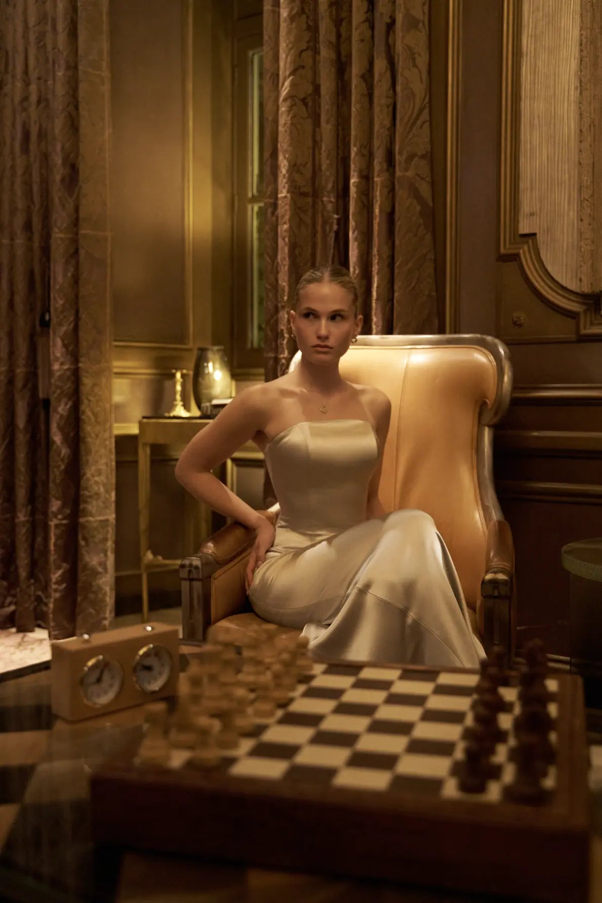 Inspired by the atmosphere of a high-society event set within a historic venue, the Fall–Winter 2025 collection celebrates timeless elegance and refined femininity. Sculptural silhouettes are balanced with fluid draping, expressed through a delicate palette of pearly white, silver, nude, gold, and black.