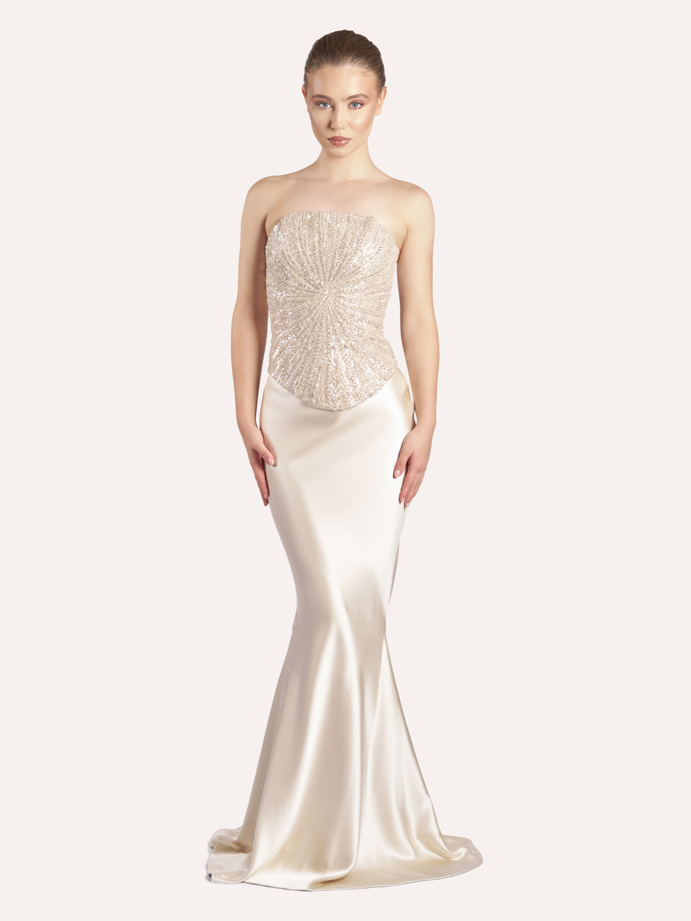 Crafted from precious materials such as Mulberry silk and embellished with Chantilly lace and hand-sewn crystal embroidery, each piece reflects a devotion to artistry and craftsmanship. Every creation is designed to carry both aesthetic and emotional significance -to be cherished, preserved, and woven into a personal story.