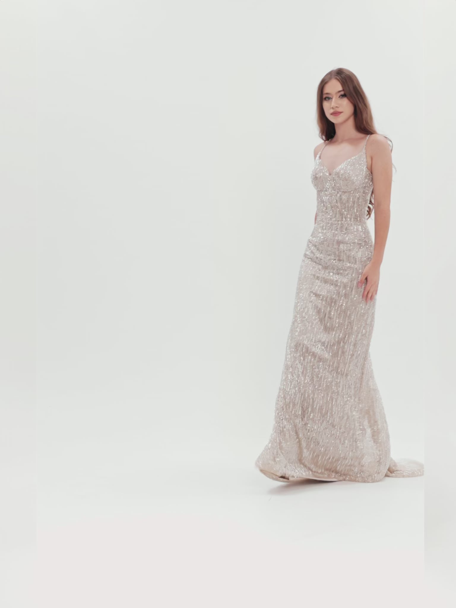 This dress is a stunning floor-length gown featuring intricate, shimmering crystal beads and sequins embellishments and a form-fitting silhouette. Perfect for a glamorous evening event, this gown is a stunning blend of classic refinement and modern luxury.